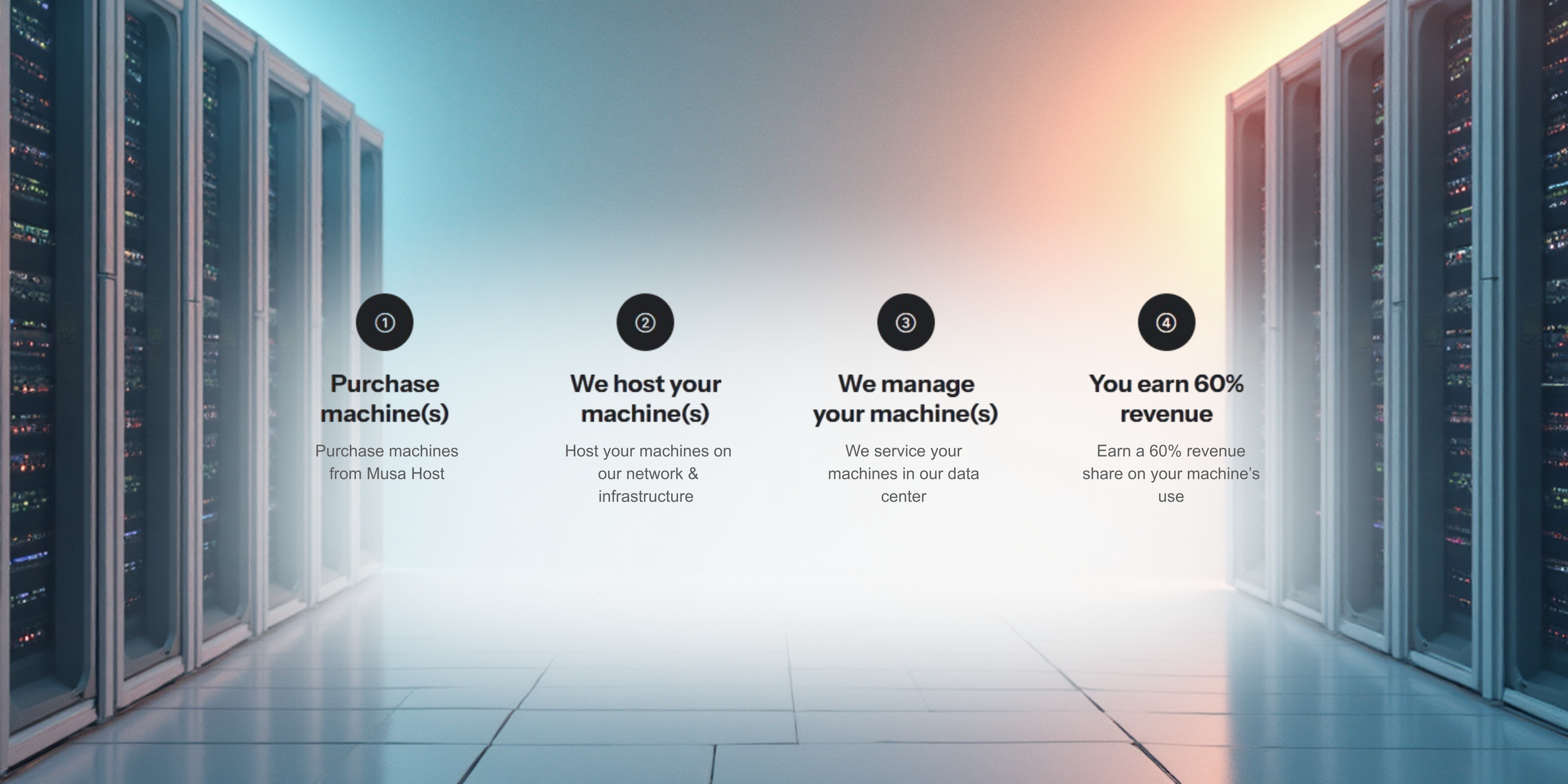 We have a one of a kind business model. You can help us build data centers by purchasing GPU machines. Once purchased, you own the machines. We host the machines on our infrastructure and you keep 60% of the revenue generated from your machines. We build the infrastructure, host your hardware, maintain your hardware, and supply customers with the computing power.